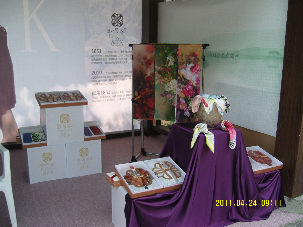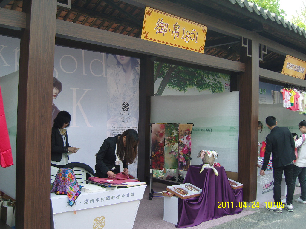 第三届中国湖州国际生态(乡村)旅游节于2011年4月25日在竹乡安吉隆重召开,“御帛1851”真丝服饰作为“丝绸之府”特色品牌参加了旅游产品的展示活动。其间,公司产品不但引来游客阵阵好评,还受到湖州旅游局的亲睐,现场与其下属“天下湖品”旅游商品购物中心签定长期合作协议,成为湖州地区丝绸类旅游商品的特定供货企业。